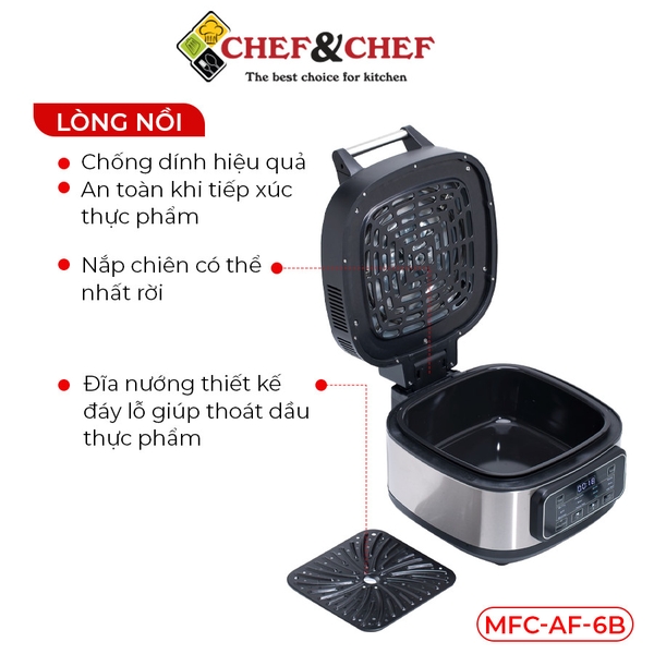 Nồi nướng Chef&Chef 12in1 trang bị lòng nồi và đĩa nướng được phủ lớp chống dính cao cấp, an toàn cho sức khỏe và giúp cho việc vệ sinh dễ dàng hơn. Sự có mặt của đĩa nướng thiết kế dạng lỗ còn giúp giảm đến 95% lượng mỡ thừa trong món ăn.