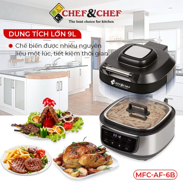 Nồi nướng Chef&Chef 12in1 có dung tích 9 lít, phần lòng nồi rộng rãi hoàn toàn có thể nướng gà, vịt nguyên con hay chế biến nhiều loại thực phẩm cùng một lúc. Không chỉ đáp ứng bữa ăn cho cả gia đình mà còn phục vụ đủ nhu cầu trong các buổi party với bạn bè.