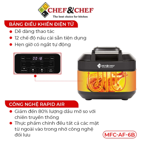 Nồi nướng Chef&Chef 12in1 sử dụng công nghệ Rapid Air với thiết kế “hình sao” độc đáo, xoáy không khí nóng hỗ trợ bạn làm những món ăn thơm ngon, giòn bên ngoài và mềm bên trong nhưng vẫn cực kỳ an toàn cho sức khỏe, hạn chế lượng dầu vào cơ thể. Kết hợp cùng công suất mạnh mẽ 1550W, Nồi nướng Chef&Chef 12in1 giúp làm chín thức ăn nhanh chóng, tiết kiệm thời gian chế biến.